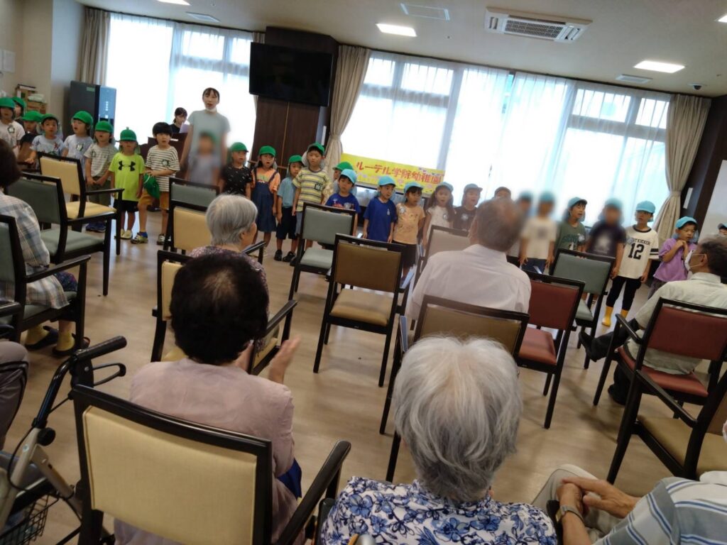 泥んこ ~年少~ » « 迷路(続編)~すみれ組~ 施設訪問 ~年長~ [ 2025-09-18 ] 今日は、近隣にあるおじいちゃん・おばあちゃん方の施設『サン あさひの』にお招きいただき、年長さんが行ってきました。 施設の方々がとても素敵な看板を準備してくださっており、歓迎してくださいました。 集まってくださったおじいちゃん、おばあちゃんに「ゆりかごのうた」と「あんたがたどこさ」の2曲、歌プレゼントをしました。 手拍子でニコニコしながら聴いてくださいました。 帰りには、手作りメダルをいただき、子どもたちはとっても嬉しそうでした。 泥んこ ~年少~ » « 迷路(続編)~すみれ組~
