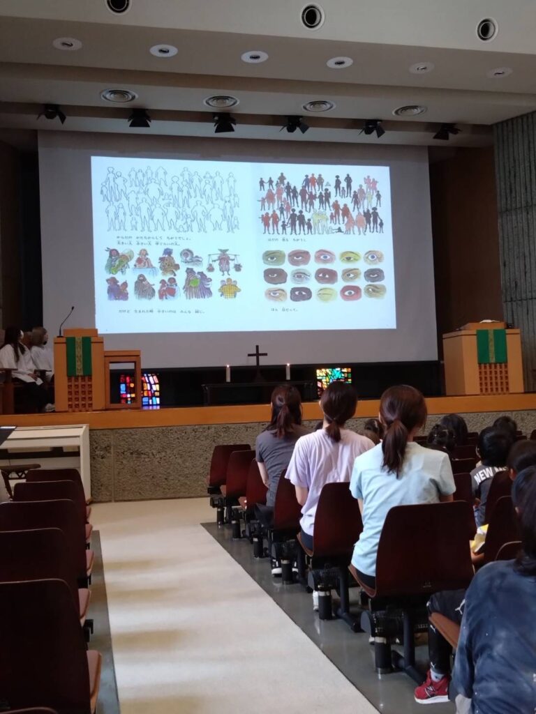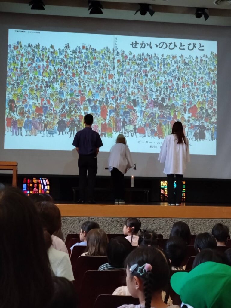 稲の収穫 ~年長~ » « 土づくり ~年長~ 絵本礼拝 [ 2025-10-01 ] 今日は、大学チャペルの絵本礼拝に年中さんと年長さんが参加し,大学生の方たち・先生方と一緒に礼拝を守りました。 チャプレンが『せかいのひとびと』という絵本を読んでくださいました。 人は容姿・考え・時間の過ごし方などみんな違っているという内容で、子どもたちは聞き入っていました。 絵本礼拝は、子どもたちにとっては親しみやすい礼拝です。 稲の収穫 ~年長~ » « 土づくり ~年長~
