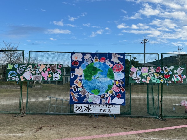 そこから、年長さんが地球を作ろうということになり、手形で地球を表現し、人、鳥、虫、魚、植物等子どもたちが思い思いの仲間を描きました。