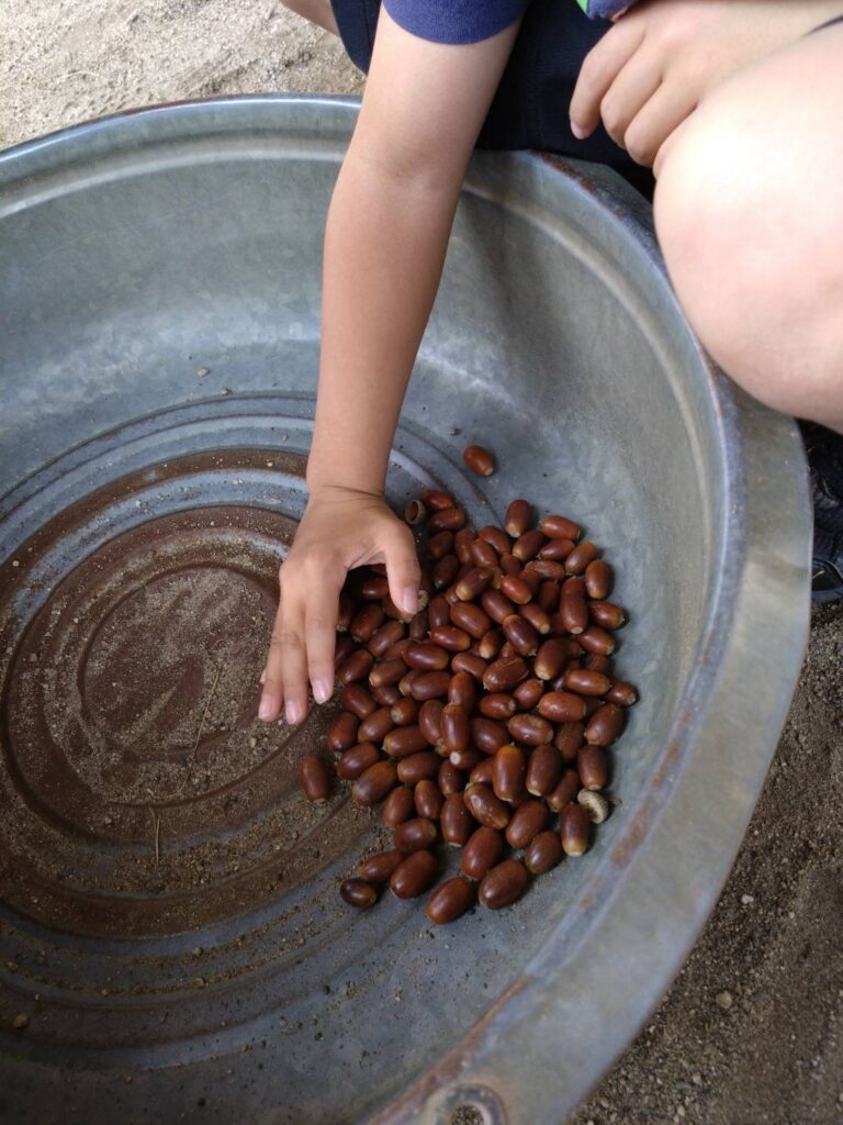 すぐにどんぐりを拾い始めました。草むらの間や木の根っこの隙間など落ちていそうな場所をひたすら探しています。