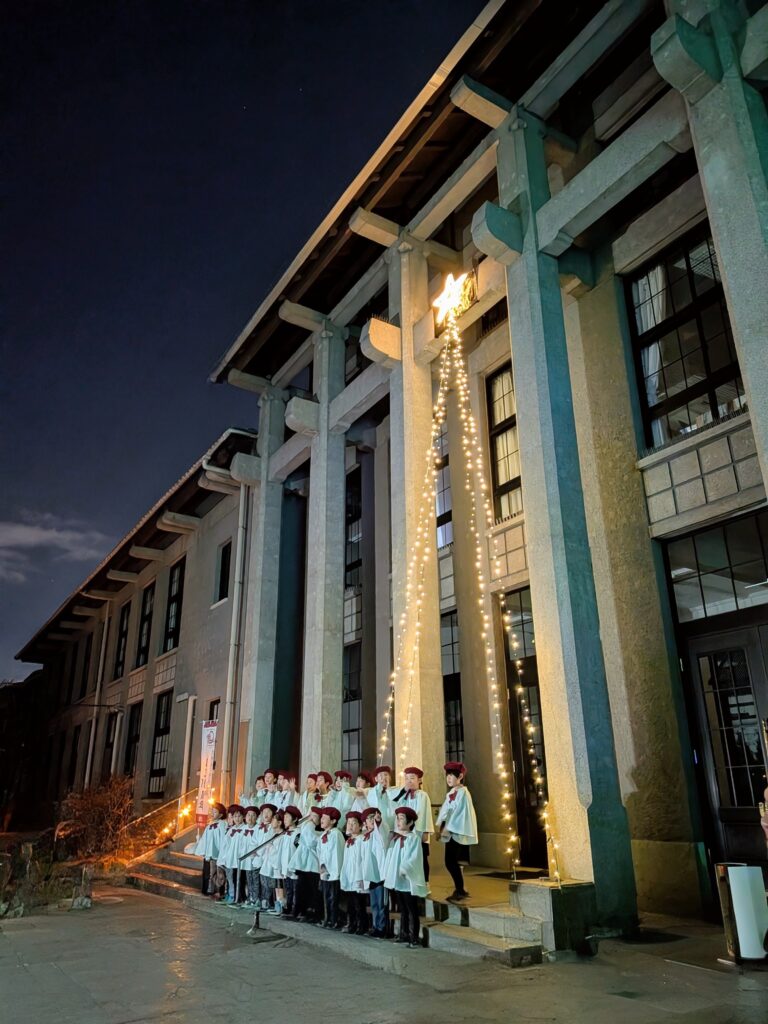 « 秋まつり 点灯式 [ 2025-12-05 ] 12月に入りクリスマスを待つアドベントの時期に入り、12/1に今年も点灯式が行われました。礼拝の後こども園の年長さんが讃美歌『アドベントクランツに』を歌い、くろかみ保育園の園児さんが点灯のスイッチを押し、イルミネーションが点灯されました。 クリスマスは『神様がひとり子のイエスさまを救い主として私たちに贈ってくださった』という出来事を記念する嬉しい日です。子どもたちとその日を迎えるための準備をしていきたいと思います。 « 秋まつり