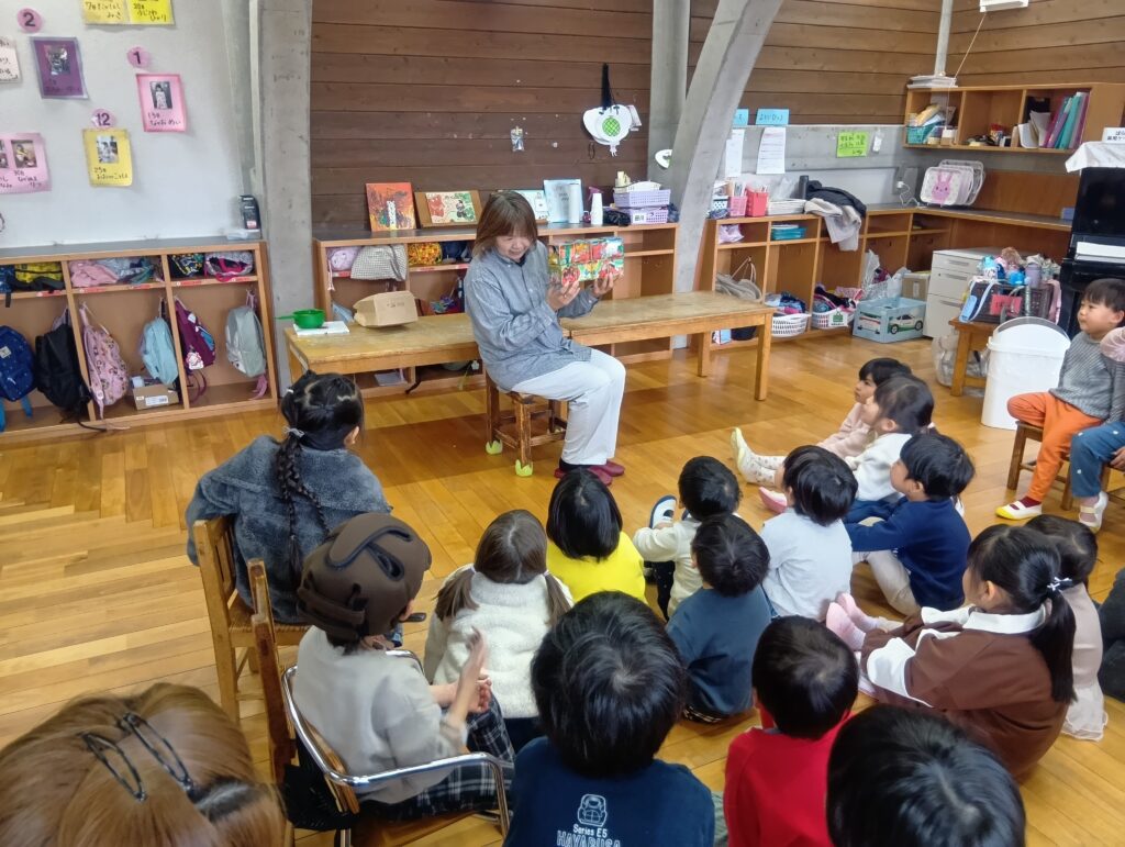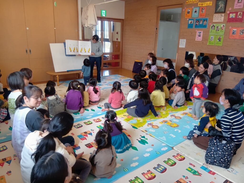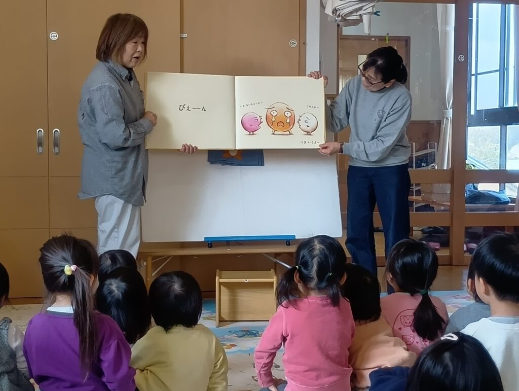 今日はNPO法人子育て支援ワーカーズペペペペらんの方が来てくださり、0歳児から年長児まで絵本、わらべうた、パネルシアター、手遊びなどたくさんのお話の世界を楽しむことができました。