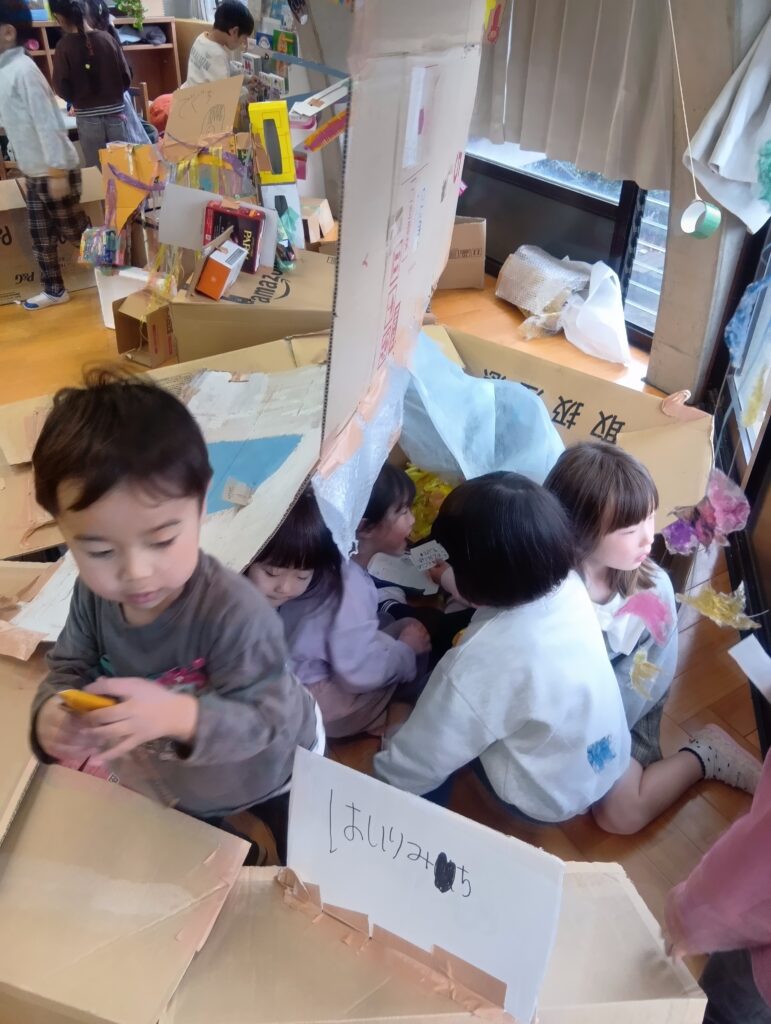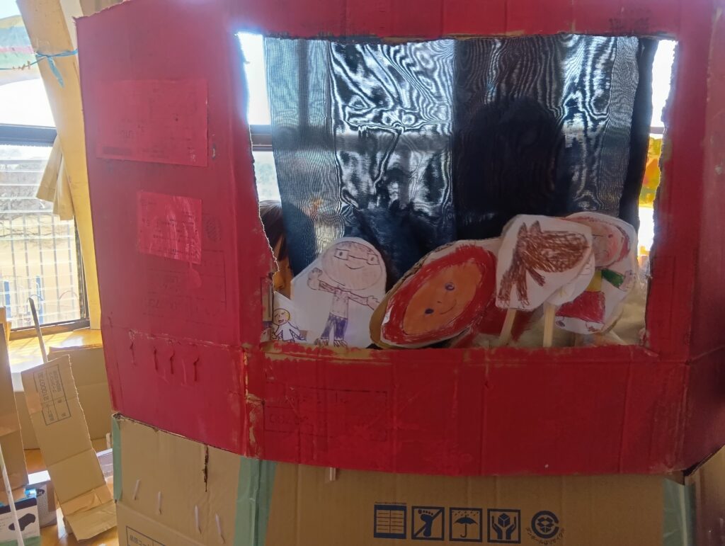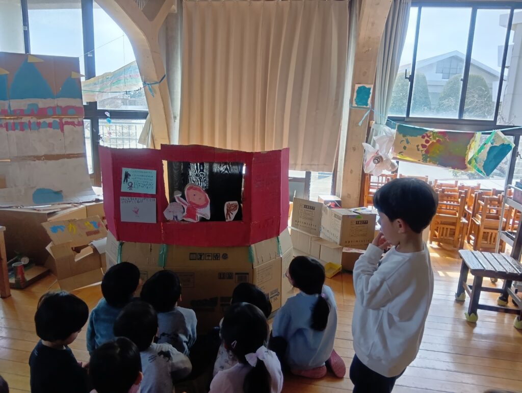 « もも組さんバスに乗ってお出かけ♪ きく組パークにようこそ! [ 2026-03-09 ] 年長5歳児きく組さんが数日かけて〝きく組パーク〟を作りました。パークの中には。。。 人形劇場があり、 赤ずきんちゃんの劇を見に、年少、年中さんのお客さんがたくさん見に来ていました。 こちらはお城の中です!段ボールにはシンデレラ城のような立派な絵が描いてあり、お城の中におじゃましている所です♪ 他にもレストランがあり、準備したきく組さんも、お客さんも楽しい時間が過ごせました。 « もも組さんバスに乗ってお出かけ♪
